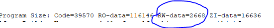 RW-data:可读可写变量,已被初始化的可读可写变量所占空间大小,存储在FLASH中。程序运行期间会变,初始化时RW-data会从FLASH拷贝到SRAM。