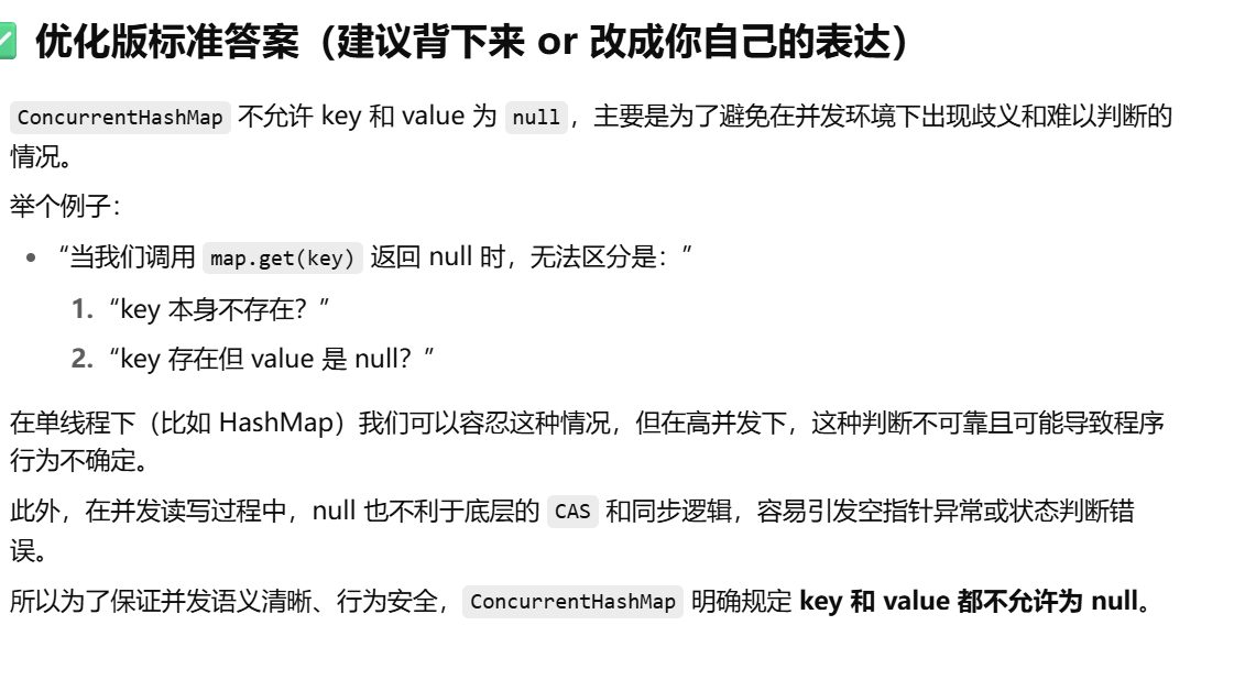 ConcurrentHashMap 不允许 null 是为了避免在多线程下歧义,比如返回 null 是表示键不存在,还是值就是 null?