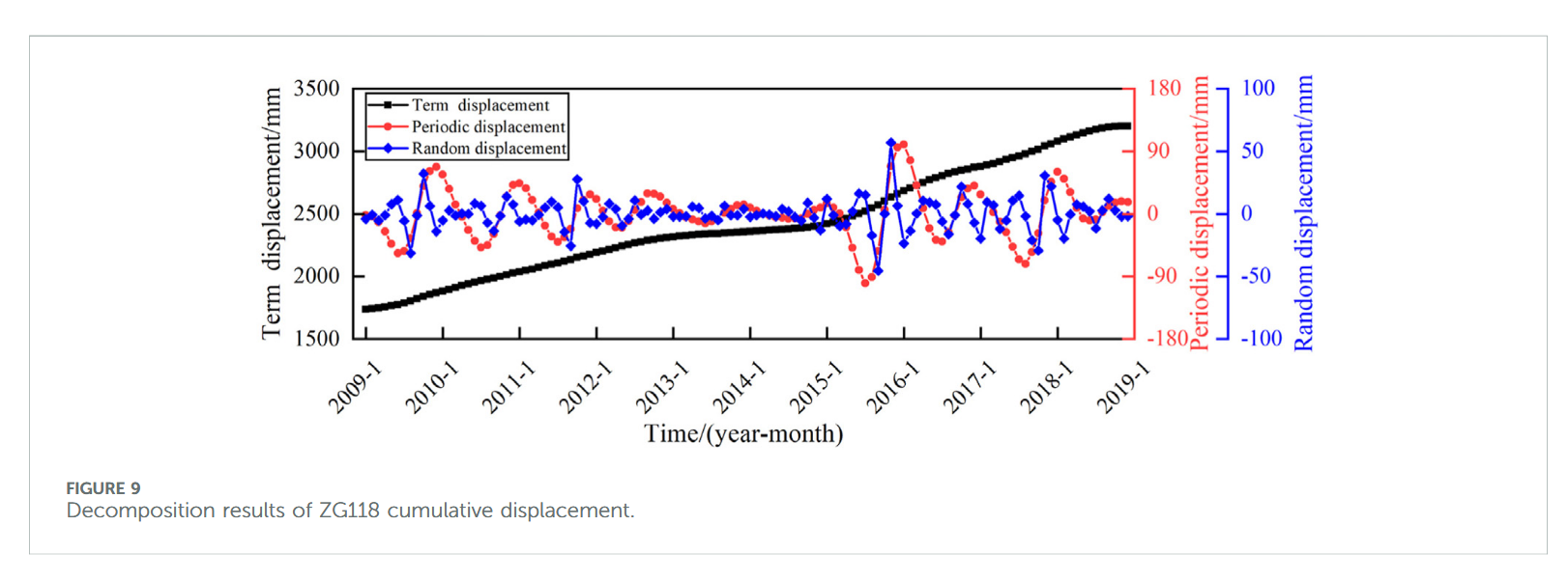 在统计分析领域,时间序列数据预测是一项极具挑战性的任务,尤其是采用时间序列分析方法时。已有研究 [5, 10, 17, 19, 30] 表明,滑坡累计位移是一种复杂的非线性序列。时间序列分析方法能够将累计位移分解为三个独立部分。主要而言,滑坡变形受趋势项位移的影响最大,而趋势项位移来源于地形、地质构造以及地层岩性等内部地质条件。趋势项位移可视为随时间近似单调递增的函数 [5, 11, 16]。本文探讨了时间对趋势项、周期项和随机项位移的影响。