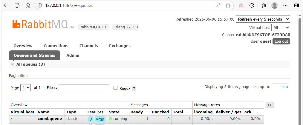 - 队列 canal.queue 绑定到交换机 canal.exchange,路由键为 canal.routing.key。