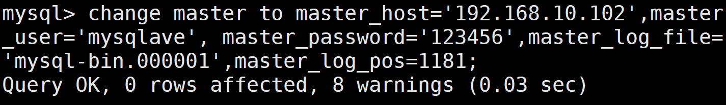 按主服务器结果更改下面命令中 master_log file 和 master log pos 参数。