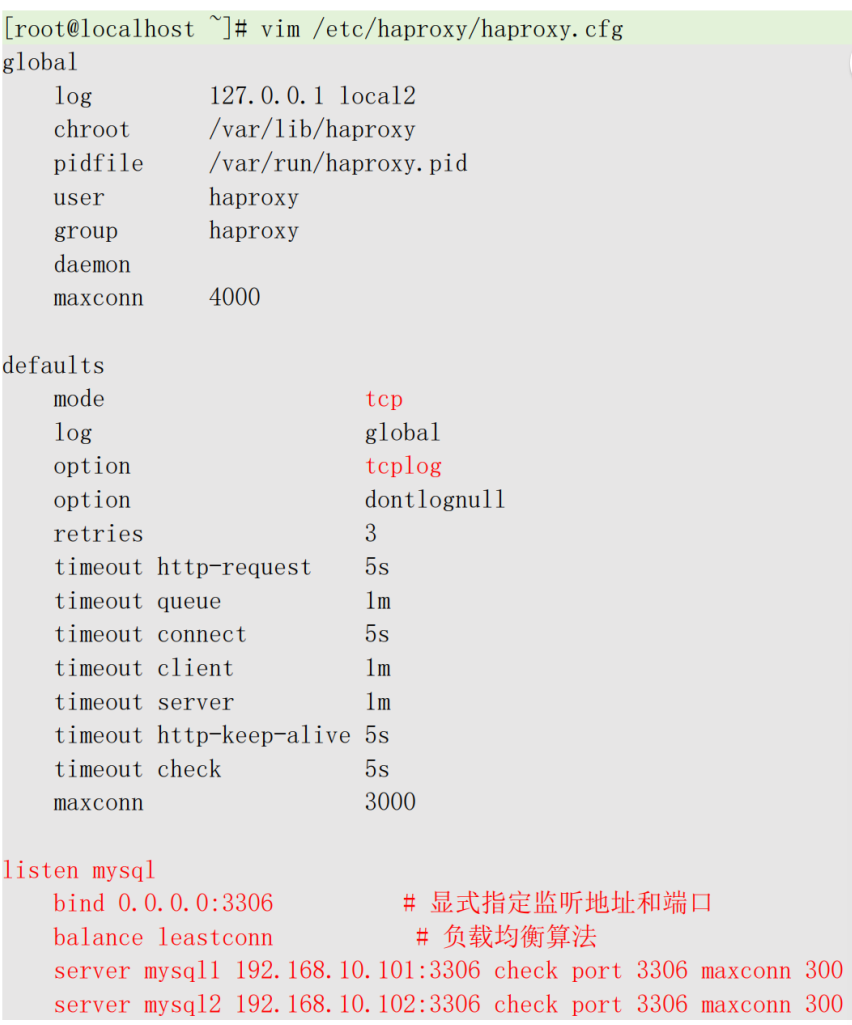 root@localhost \~\]#mysql -utest -p123456 -h192.168.10.103 -P3306 4.安装 keepalived Keepalived 是一个用于实现系统高可用性和负载均衡的工具,通过 VRRP(Virtual Router Redundancy Protocol)等协议管理虚拟 IP 地址,持续监测服务器健康状态,当主节点故障时自动将流量切换至备用节点,确保服务不中断,常用于数据库、Web 服务等集群环境,提升系统可靠性并简化故障恢复流程。 (1)关闭 SELinux和防火墙  (2)安装 keepalived  (3)编辑 haproxy配置文件 Keeppalived1 配置,红色标注为两台不同之处,需要注意  添加监控脚本并启动 keepalived \[root@localhost \~\]#vim /etc/keepalived/chk.sh  \[root@localhost \~\]#chmod +x /etc/keepalived/chk.sh \[root@localhost \~\]#systemctl start keepalived Keeppalived2配置,红色标注为两台不同之处,需要注意   添加监控脚本并启动 keepalived \[root@localhost \~\]#vim /etc/keepalived/chk.sh \[root@localhost \~\]#chmod +x /etc/keepalived/chk.sh \[root@localhost \~\]#systemctl start keepalived \[root@localhost \~\]#ip a  (4)编测试使用 VIP连接 mysq1 \[root@localhost \~\]#mysql -uroot -p123456 -h192.168.10.100 5.测试故障转移 1.关闭 master1 主机,测试使用 vip 能否正常访问 mysql 数据库关闭 master1后,因为 master1、master2 通过 haproxy 负载均衡,master1关闭后,haproxy 检测其状态异常,会从负载中移除,不进行流量转发,依然可以通过 vip 访问 mysql,实现 mysql 的高可用 \[root@localhost \~\]#ping 192.168.10.101 \[root@localhost \~\]#mysql -uroot -p123456 -h192.168.10.100 2.接着关闭 keepalived1,测试使用 vip 能否正常访问 mysql 数据库 关闭 keepalived1 后,keepalived 检测到主节点离线,VIP 192.168.10.100会漂移至 keepalived2 节点,mysql 依然可以访问 \[root@localhost \~\]#ip a  \[root@localhost \~\]#mysql -uroot -p123456 -h192.168.10.100