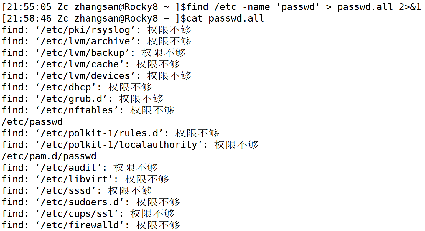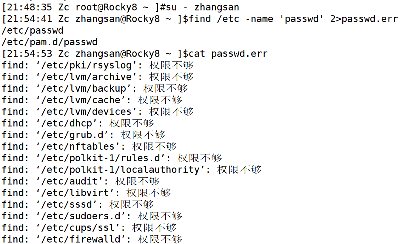 这里是因为用的root用户没有权限不足的问题,当使用cat passwd.err时显示为空,如果切换为普通用户就会看到错误信息