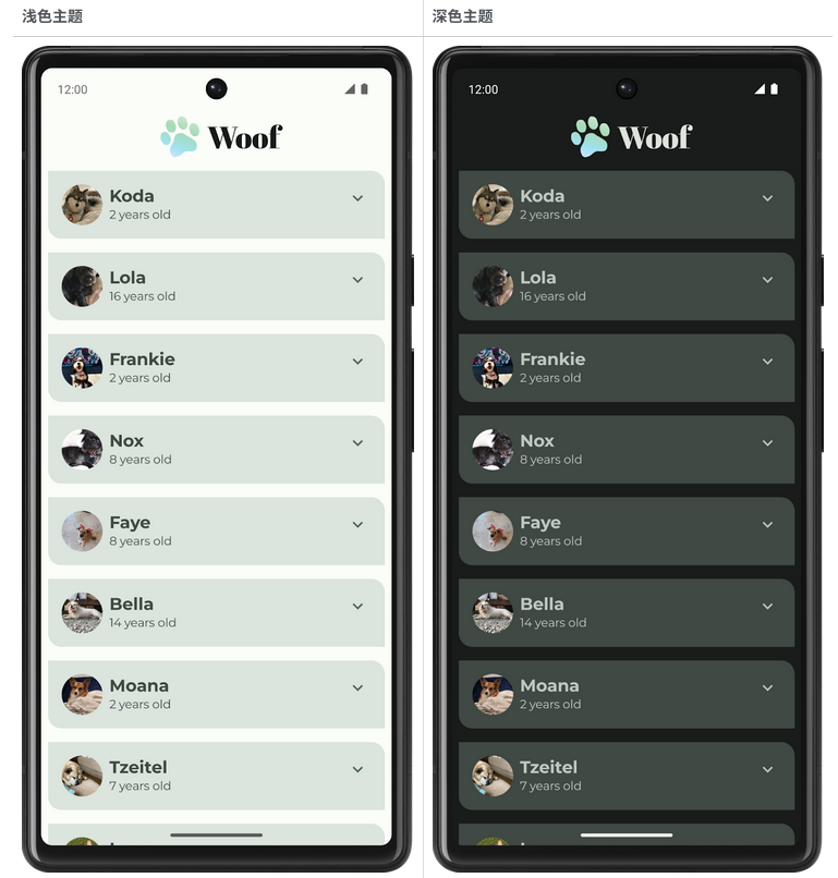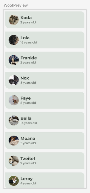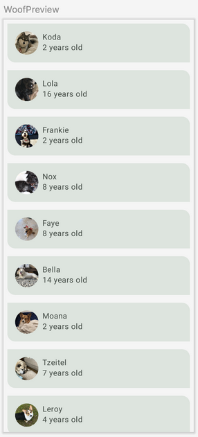 查看 WoofPreview()。添加了 WoofTheme(),以提供您在 WoofPreview() 中看到的 Material 主题设置。