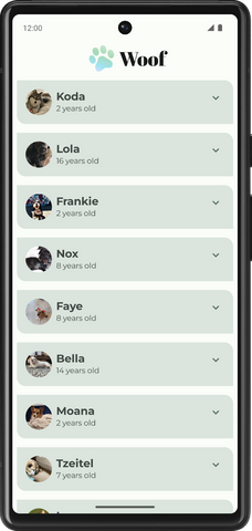 有关狗狗爱好的注意事项: 所有狗狗的爱好信息均已在起始代码中提供给您。如需在代码中查看此类信息,请打开 data/Dog.kt 文件,查看预先填充了狗狗信息的 dogs 列表。