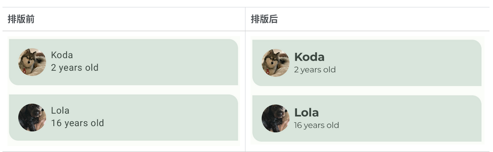 将第一个可组合项的 text 设置为 strings.xml 文件中的 about,并将 style 设置为 labelSmall。将第二可组合项的 text 设置为传入的 dogHobby,并将 style 设置为 bodyLarge。