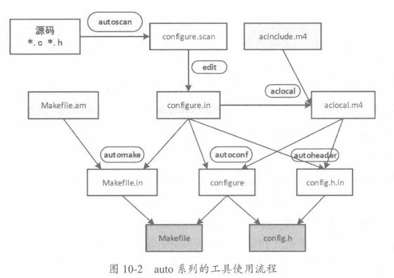 简单项目我们可以手动编写Makefile,但大型软件需适配不同系统,难以手动编写,此时可使用GNU auto系列工具,这些工具需配合使用,步骤如图10-2: