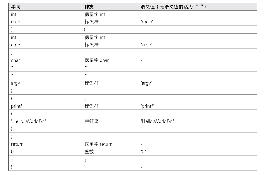 单词的种类是指该单词在语法上的分类,例如单词"54"的种类是"整数"。语义值(semantic value)表示单词所具有的语义。例如,在C语言中,单词"54"的语义为"数值 54"。单词""string""的语义为"字符串"string""。"printf"和"i"的语义有可能是函数名,也有可能是变量名。