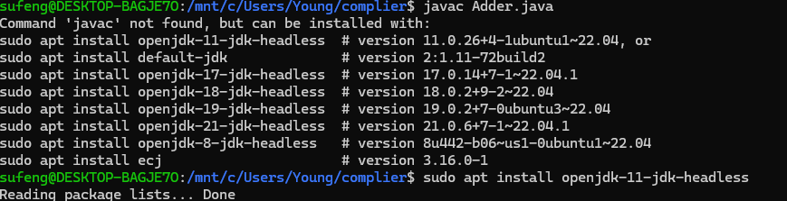 要编译生成的Adder.java,只需要javac命令即可。输入命令试着进行编译: