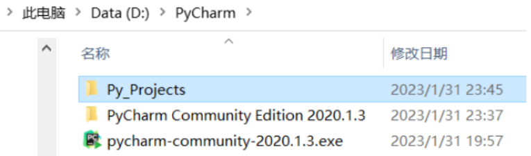 完成第一次配置后,首先在 D:\PyCharm 中创建文件夹 Py_Projects 存放工程。
