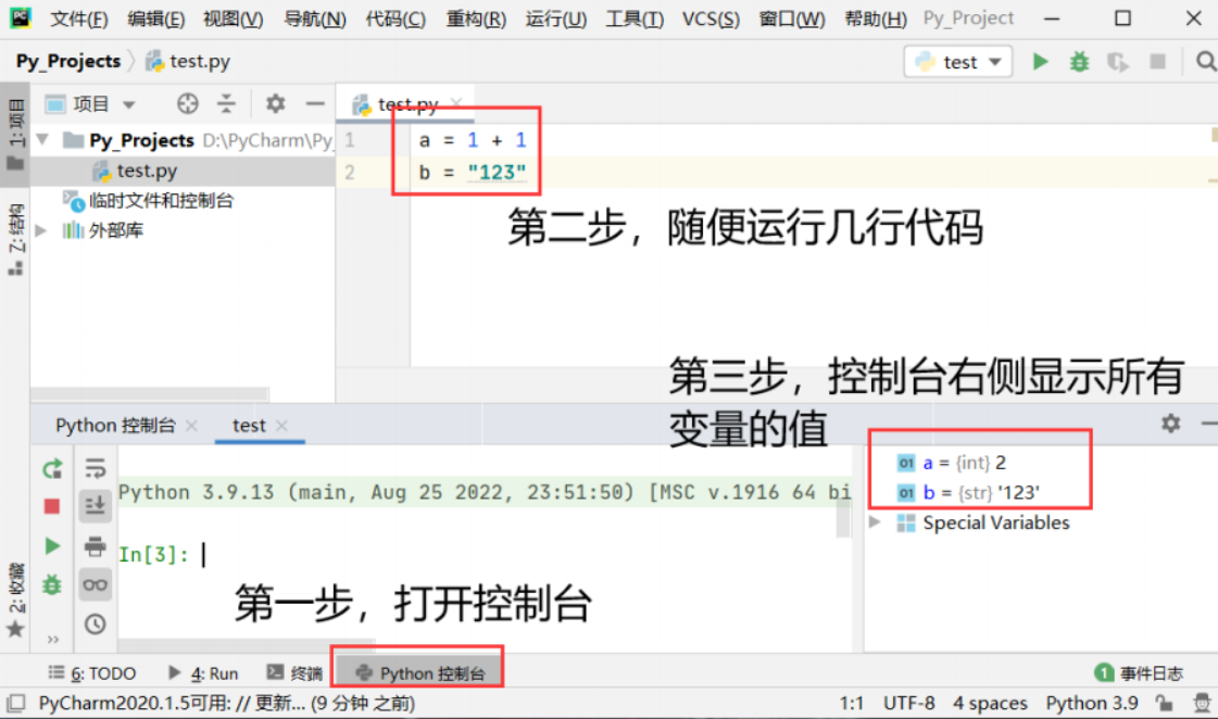 打开控制台,再运行.py 文件,控制台右侧即可显示每个变量的数值。