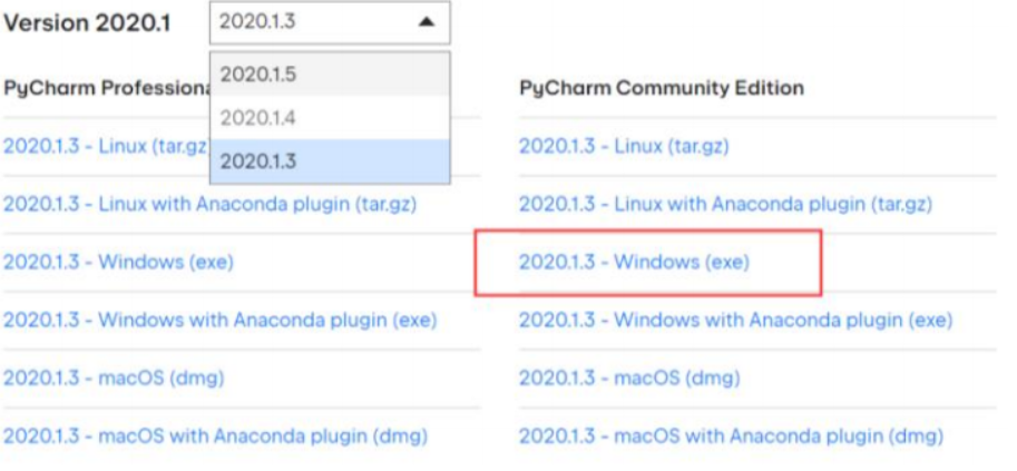 推荐下载社区版(足够个人使用)的 2020.1.3-win 版本,如图 所示。