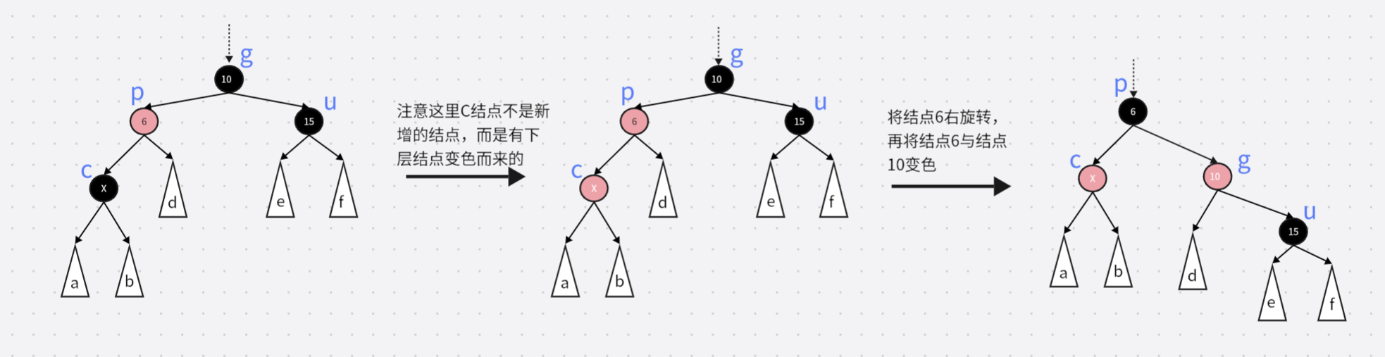 p是g的右子节点,c是p的左子节点 → 先右旋p,再左旋g,c染黑,g染红。