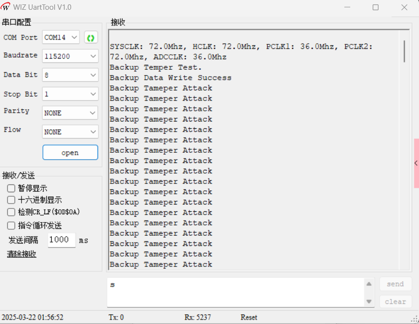 - 当篡改引脚(默认 PB12)检测到低电平触发时,触发中断。