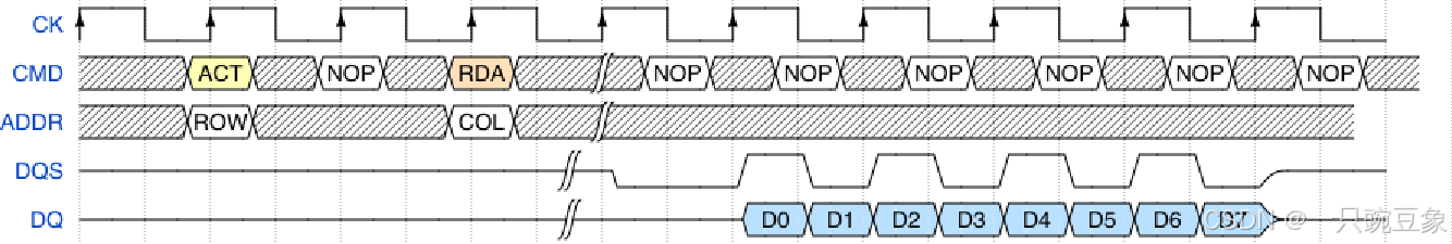 第二步是发出带自动预充电的读命令(RDA,Read with Auto-Precharge),此时地址总线上的值是列地址。