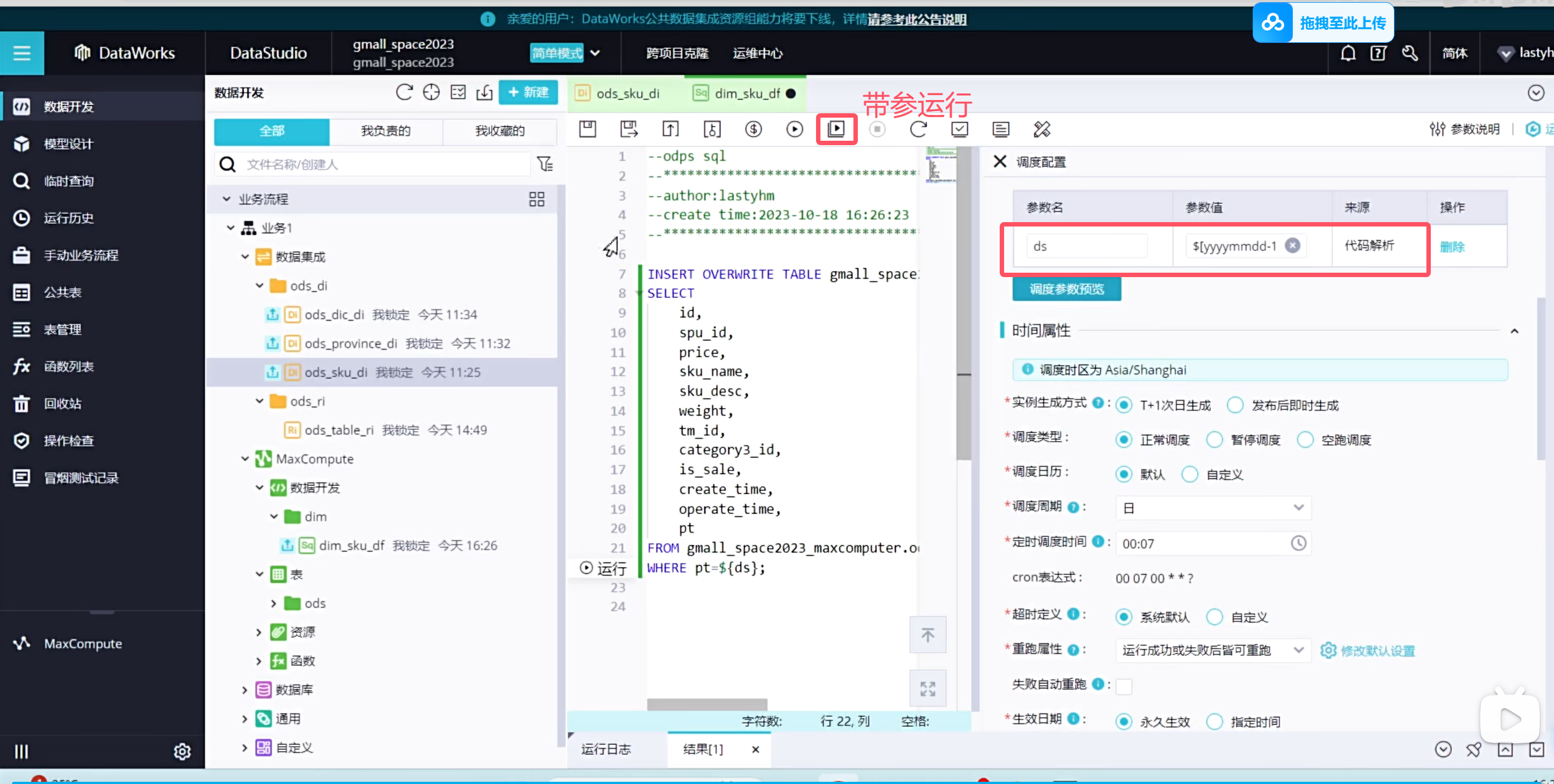 默认的调度是每天同步处理昨天的业务数据,在测试环境中,可以随意填写参数直接运行