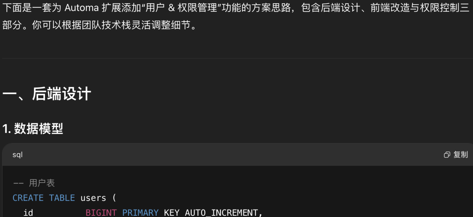答2:下面是一套为 Automa 扩展添加"用户 & 权限管理"功能的方案思路,包含后端设计、前端改造与权限控制三部分。你可以根据团队技术栈灵活调整细节。如图: