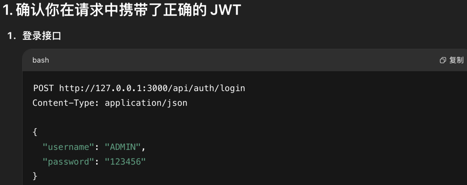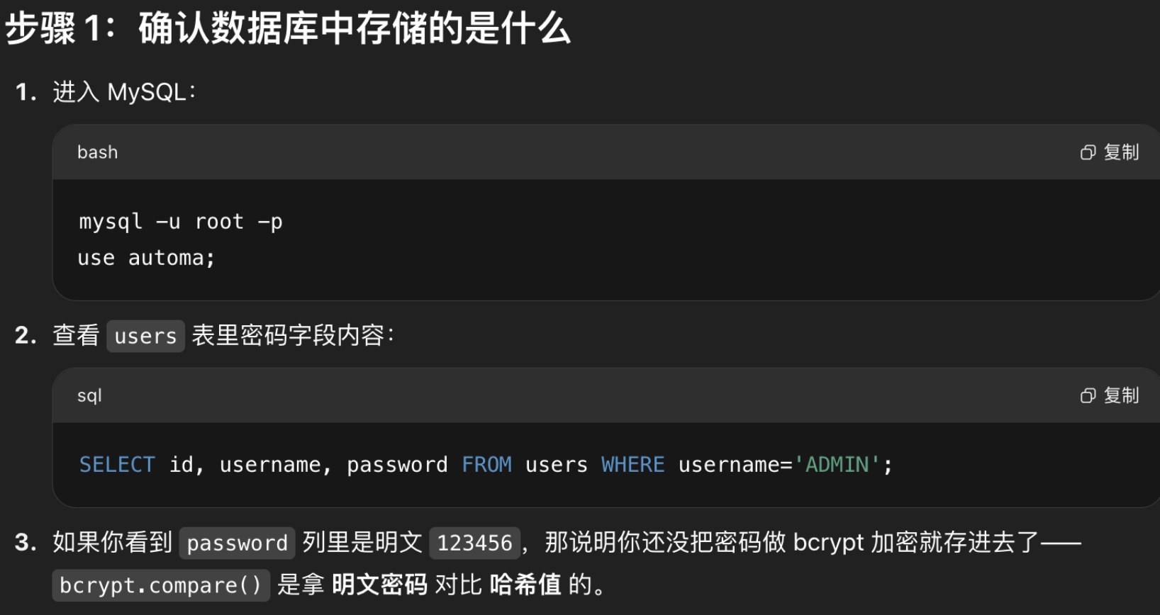 问6:我数据库中创建的用户ADMIN密码是123456,但是通过postman提交相同信息,返回: { "message": "密码错误" }