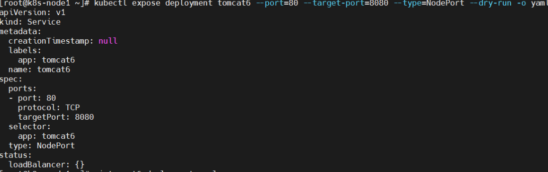 kubectl expose deployment tomcat6 --port=80 --target-port=8080 --type=NodePort --dry-run -o yaml