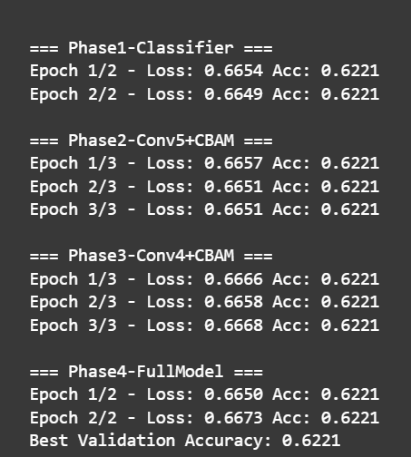 {'name': 'Phase3-Conv4+CBAM', 'train_layers': ['features.16', 'features.17', 'features.18', 'features.19', 'features.20', 'features.21', 'features.22', 'features.23', 'features.24', 'features.25', 'features.26', 'features.27', 'features.28', 'classifier'], 'epochs': 3, 'lr': {'features': 1e-4, 'classifier': 1e-4}},