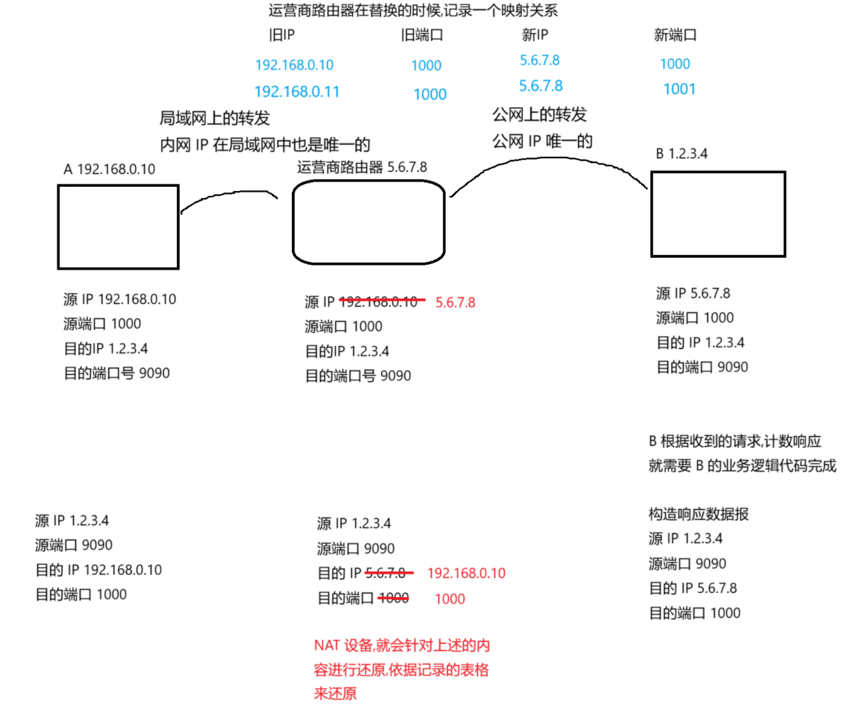 这样的替换,本质上是让一个局域网内部的所有设备,公用同一个 外网 IP(本来是一个外网 IP 代表一个设备,现在是一个外网设备代表数以千计个设备(和真实世界的地址类似))