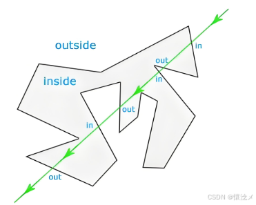 射线法是一种用于计算几何的经典算法,主要用于判断点与多边形的位置关系(如点在内部、外部或边界上)。其核心思想是:从该点引一条水平向右的无限长射线,统计射线与多边形边界的有效相交次数。若交点数为奇数,则点在多边形内部;若为偶数(包括零),则在外部。算法需处理边界重合、顶点相交等特殊情况,时间复杂度为O(n),适用于任意简单或复杂多边形。