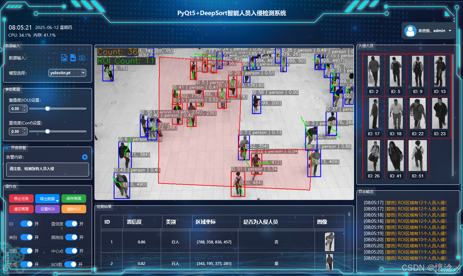 本次使用PyQt5+DeepSort实现了一个智能人员入侵检测系统,系统包括多个区域支持ROI感兴趣区域标注告警,支持展示区域内标签显隐控制,自动统计全部目标以及ROI区域内目标,支持数据导出、入侵人员照片查看,动态阈值调整。