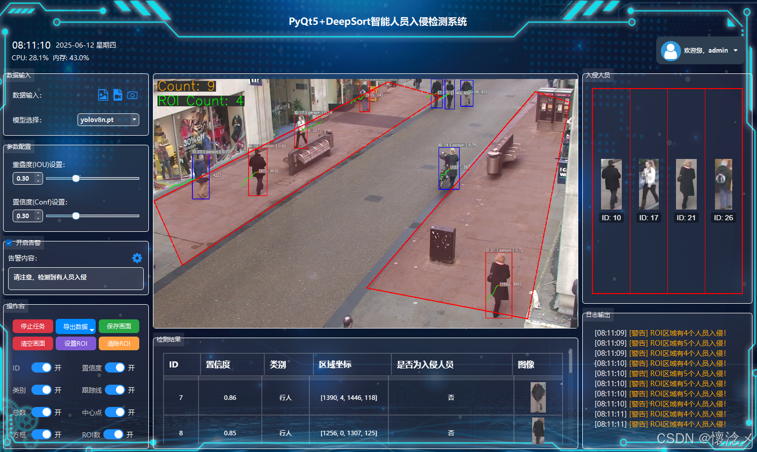 基于PyQt5+DeepSort+YOLOv8智能人员入侵检测系统
