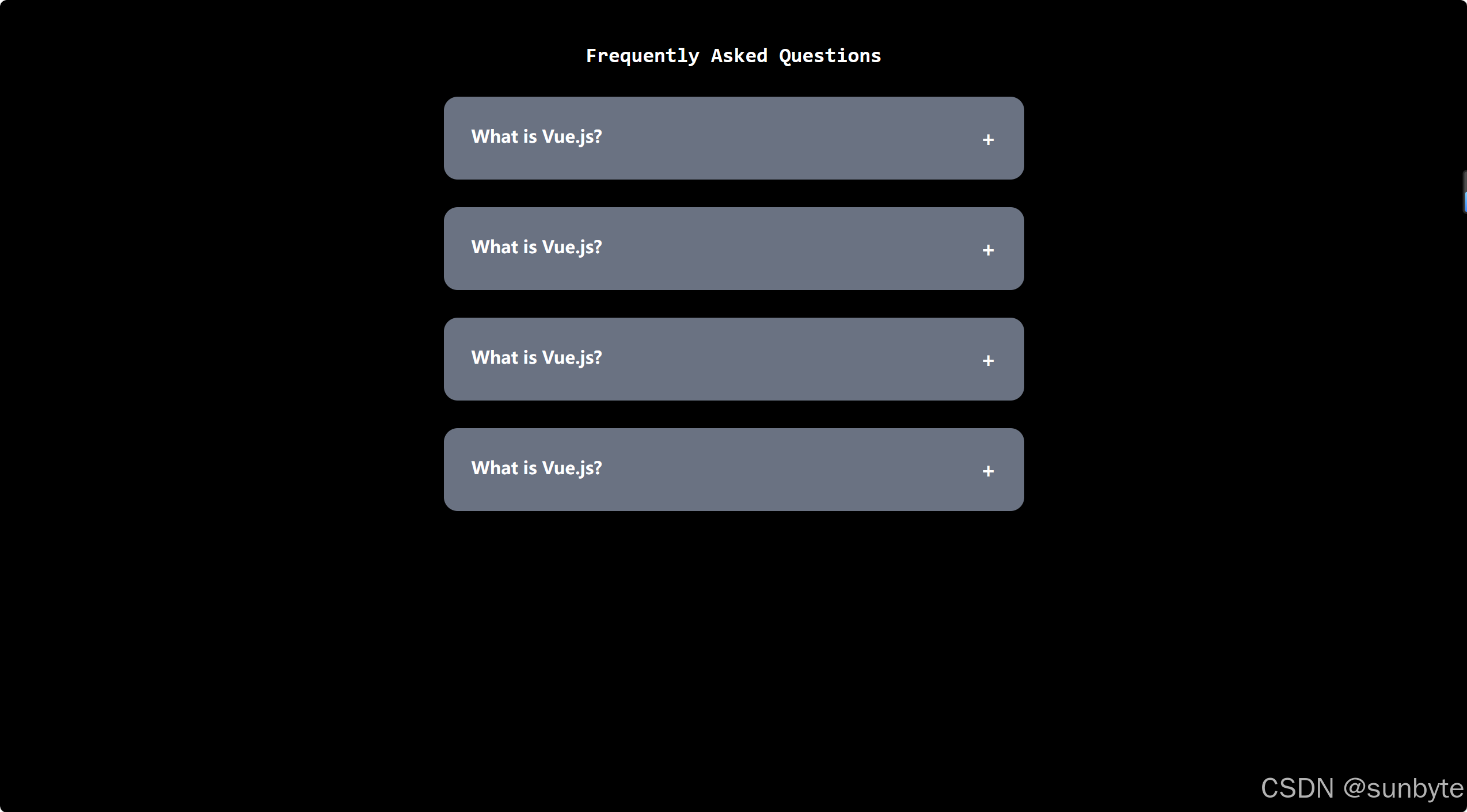 这个 FAQ 折叠面板组件虽然功能简单,但涵盖了 Vue 3 的响应式系统、条件渲染、事件处理以及 <Transition> 动画组件的使用,同时借助 TailwindCSS 快速实现了美观的 UI 设计。