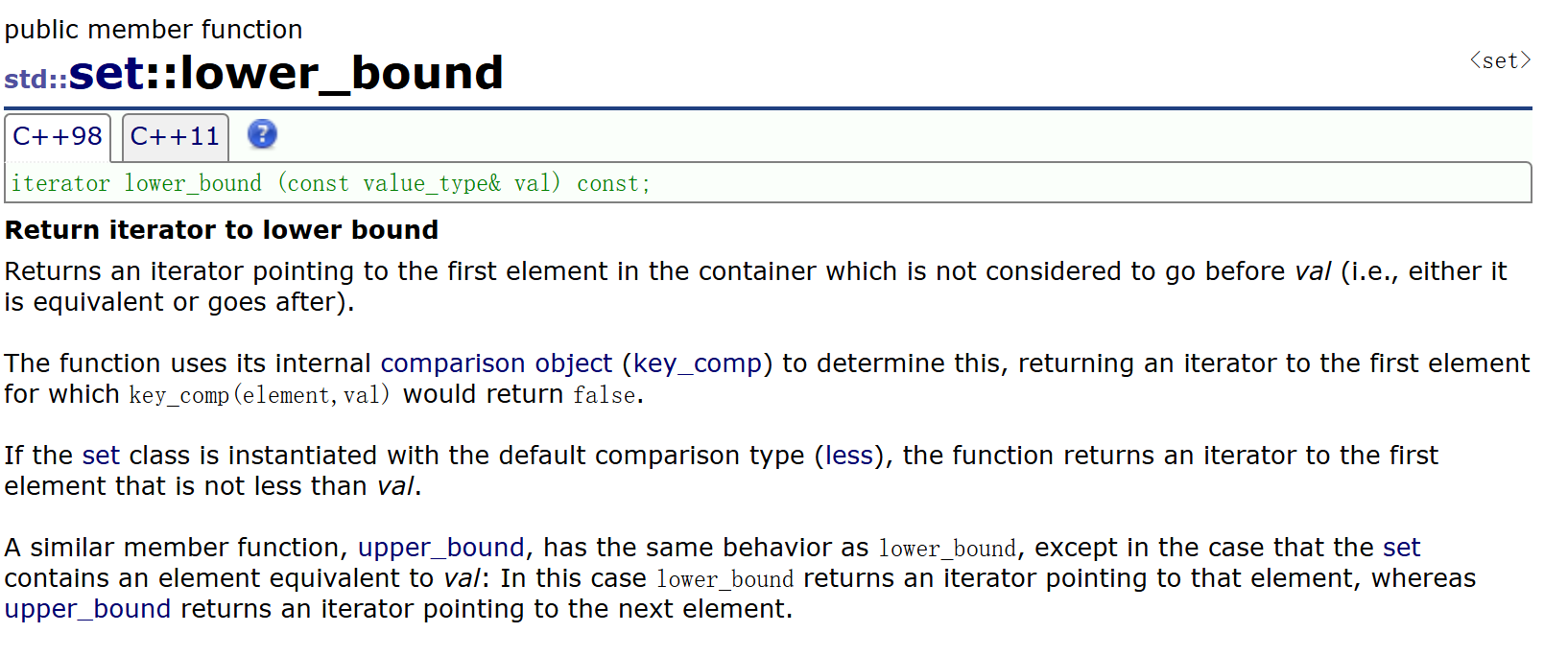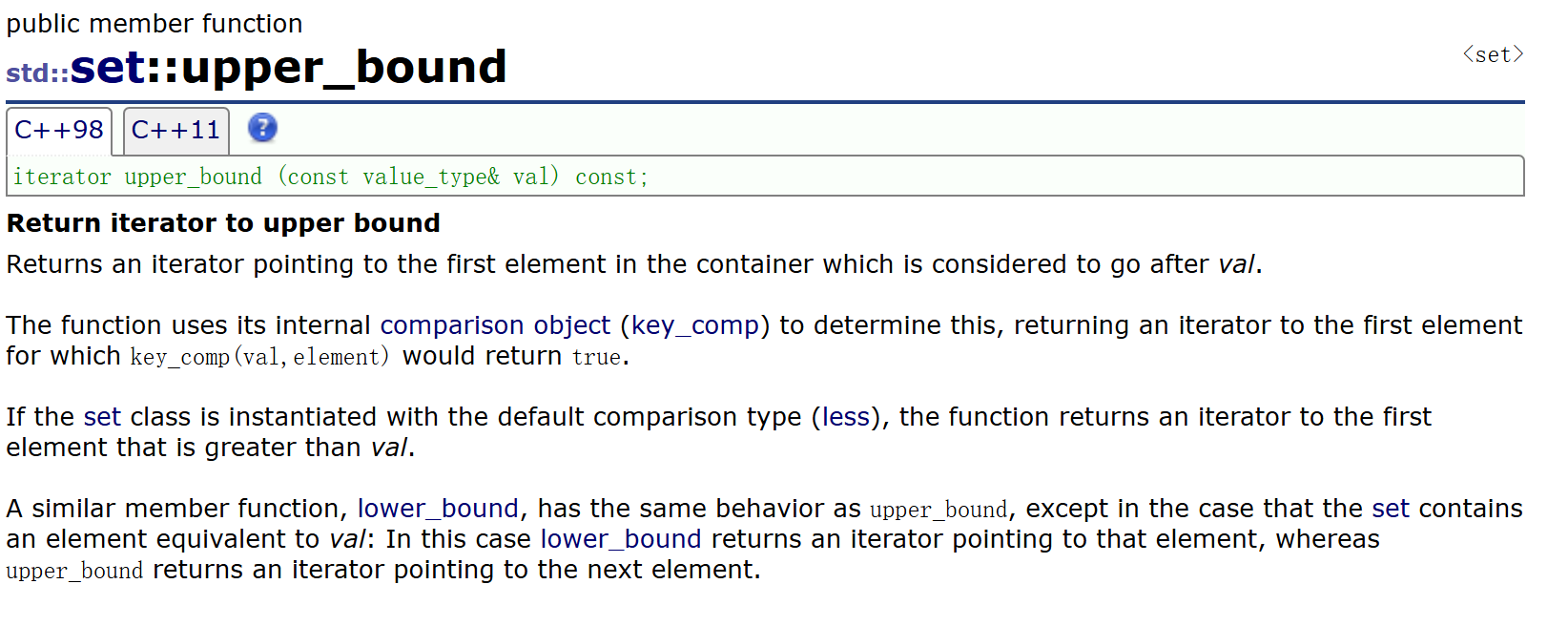 它们通常一起使用,lower_bound返回set中的第一个key值>=val值的结点的迭代器,upper_bound返回set中的第一个key值>val值的结点的迭代器 。它们的作用是找一段值的区间。