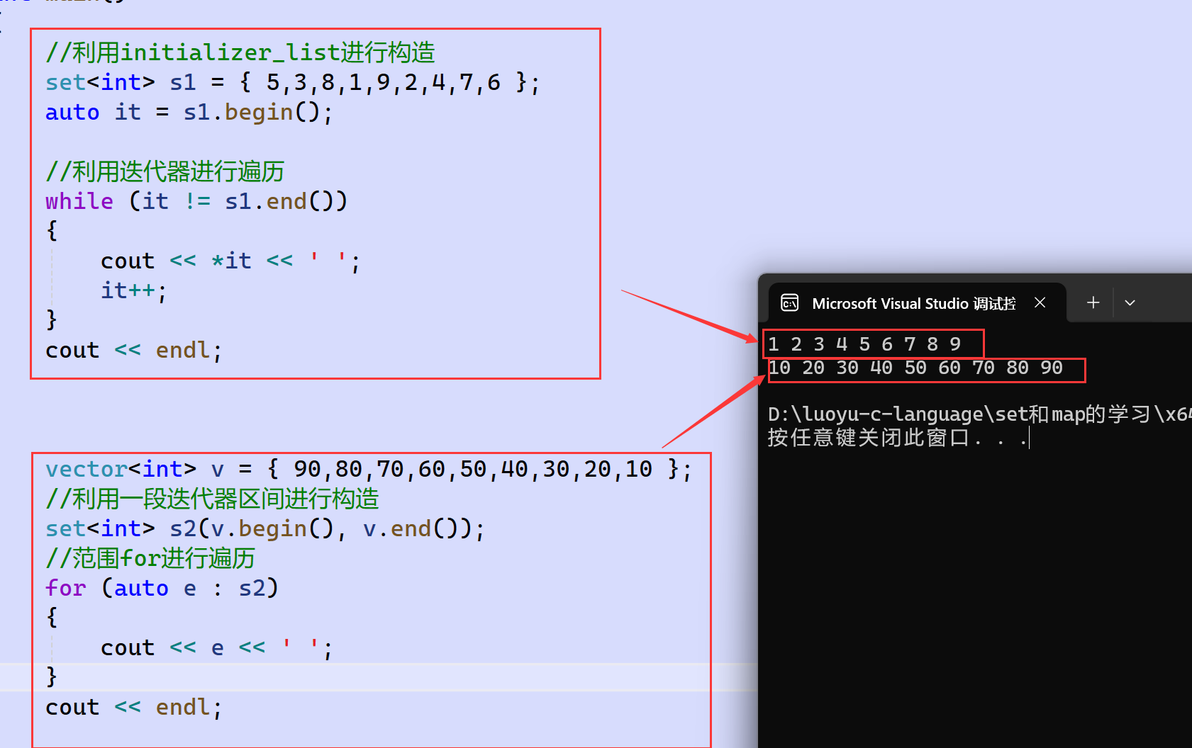 set支持正向和反向迭代器,也支持范围for,迭代器++和范围for都是按照树的中序顺序进行遍历。但是set的iteritor和const_iteritor都不支持迭代器修改key,会破坏底层搜索树的结构。