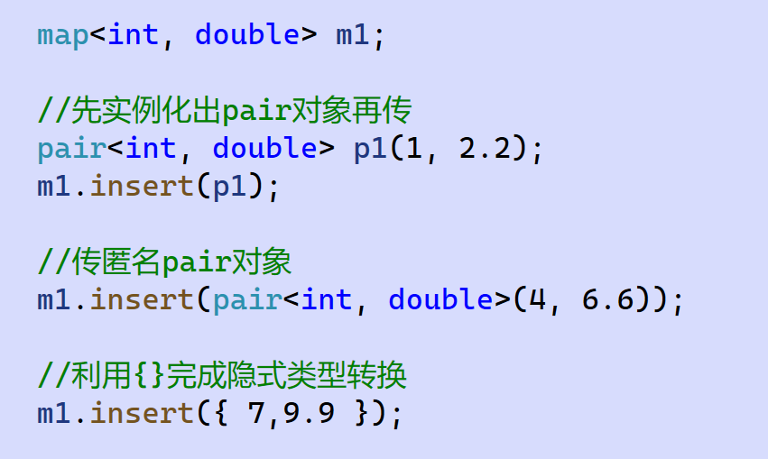 insert要求的参数是一个pair,这里其实就很灵活了。可以构造对象再传参、匿名对象传参、隐式类型转换传参: