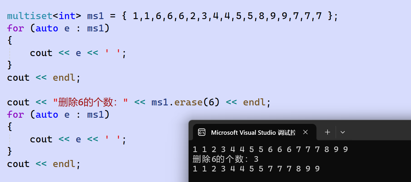 size_type erase (const value_type& val);会删除所有key值为val的结点,返回值是删除的结点的个数。因为multiset中可能有重复key值,所以返回值可能是任何非负整数。 - count:和set一样,也是记录返回key值为传参val的结点个数。因为multiset中可能有重复key值,所以返回值可能是任何非负整数。