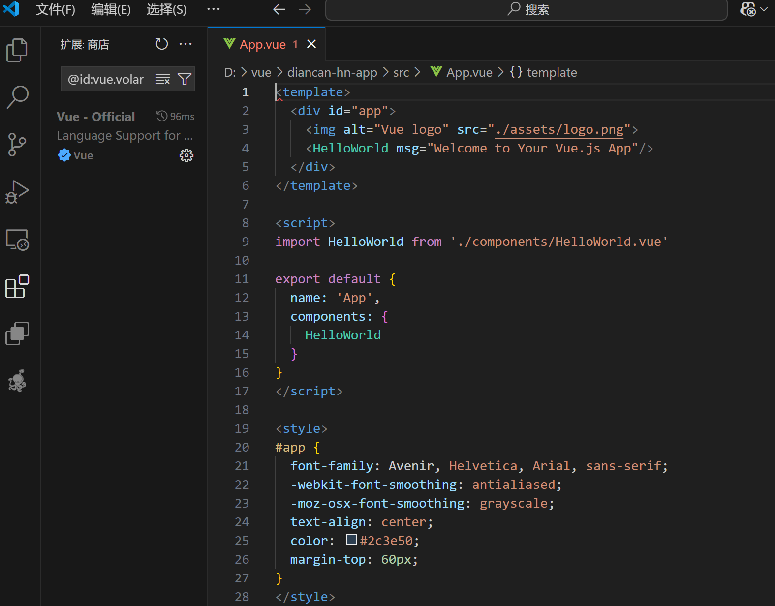 如果安装了vscode,点击打开vue文件会自动跳到vscode的编辑页面,例如点击App.vue: