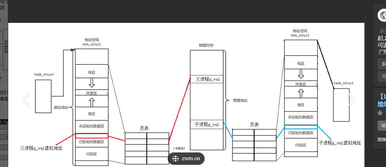 所以父子进程里在相同的地址取出不同的值是因为每一个进程都有一个自己的页表,子进程拷贝了父进程的页表,在硬件上就是电平充放电的过程,当我们修改一个父子进程公用的值的时候,系统会识别到,就会发现我们要访问的目标数据是与父进程共享的,所以在我们写入的时候开辟了一段新空间,把子进程的页表对应的物理地址修改了,所以父子进程的被修改的值的物理地址是不一样的。