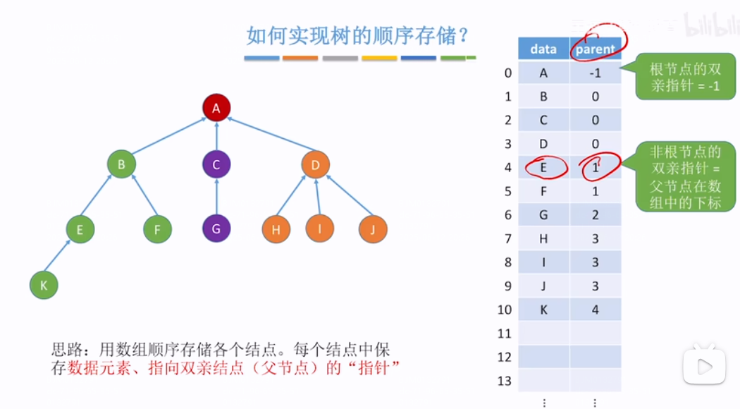 因为在树中每个节点除了根节点之外都有唯一的父节点,所以可以把各个节点放在数组中各个索引位置上,另外在数组中再加一个字段表示该节点的父节点索引位置,根节点没有父节点则对应的父节点索引位置设为-1,如下第2张图,根节点A的parent=0,E和F的parent=1,即数组中Index=1即B节点