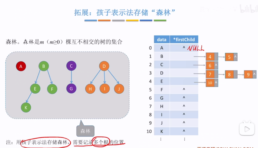 孩子表示法也可用来表示森林,因为森林有多个树,每个树都有一个根节点,先把所有根节点放到数组中,然后再层次遍历其他节点放在数组中,在记录根的位置时因为有多个根节点所以需要记录多个根的位置