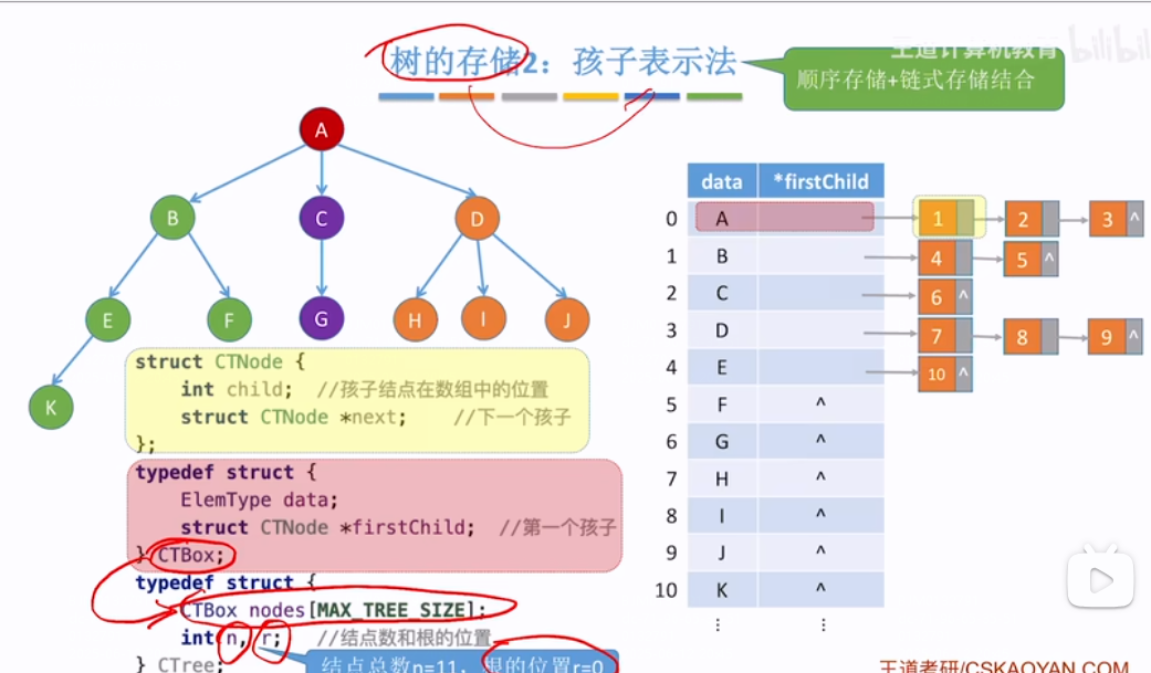 CTBox每个节点信息中包括data字段存储节点元素的数据和指向第一个孩子的指针firstChild,指针firstChild中包括该孩子节点在数组中的索引位置+指向下一个孩子的指针。struct结构体中包含CTBox数组存储所有的节点+n变量表示树中一共有多少元素+r记录根节点在数组中的index索引位置,孩子为空的firstChild指针记为NULL