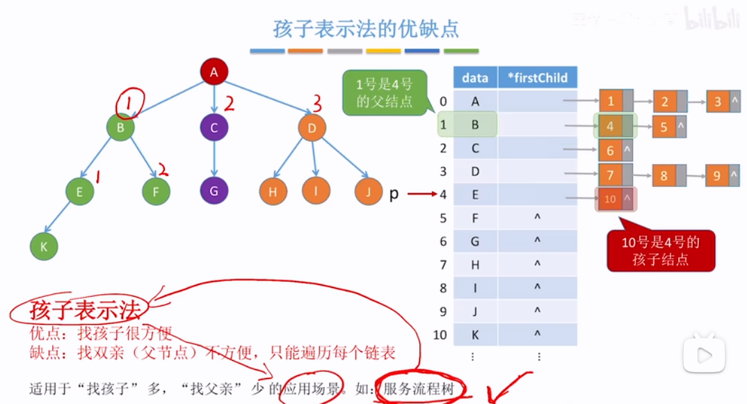 在找某个节点的孩子时,直接找该节点对应的firstChild字段指向的链表即可找到所有孩子节点的index位置,找孩子方便,在找某个节点的父亲时,只能遍历所有的节点的链表,然后找出firstChild指向的孩子链表中有该节点的元素,对应的data即为该节点父亲,即找父亲时不方便,适用于找孩子多,找父亲少的情况,如服务流程树,拨打电话普通话服务请按1,然后再问你办理业务1按#键啥的,,,,直到找到最下一层服务节点