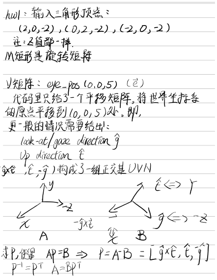 get_model_matrix(angle)的函数只是构建了一个旋转矩阵。所以原本的三角形,即std::vector<Eigen::Vector3f> pos{``{2, 0, -2}, {0, 2, -2}, {-2, 0, -2}};就是在世界坐标系下面表示的。旋转三角形,即直接在世界坐标系下面旋转,就可以做到在屏幕上旋转 - 视图变换(View Transformation) :将世界空间变换到相机(观察者)空间,模拟相机位置和方向。代码在