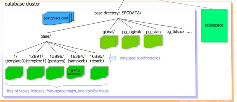 > Database cluster(数据库集簇):由postgresql server 管理的数据库的集合,下面由多个 database 组成。一个数据库集簇可以包含多个 Database、多个 User,每个 Database 以及 Database 中的所有对象都有它们的所有者:User。