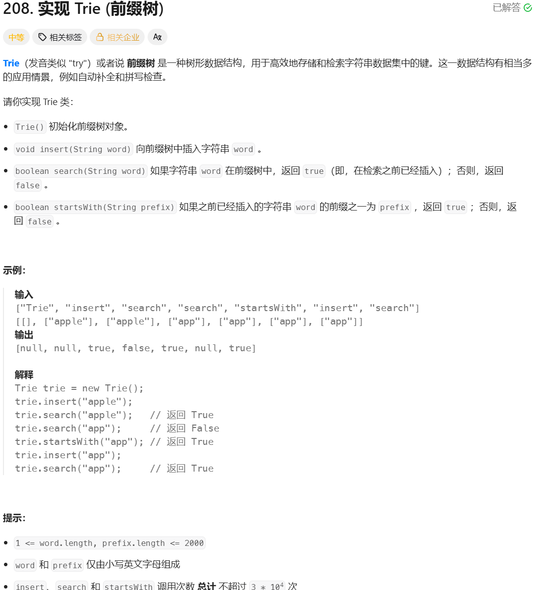 前缀树的作用在于快速检索字符串的前缀,插入一个字符串,即为从根一次插入孩子节点,将字符串最后一个字符对应的节点标记结束节点,再插入另外一个相同前缀但最后n个字符不一样的字符串,那么在相同前缀的部分,不需要插入新的节点,直到第一个不同的字符,添加一个新的子节点。