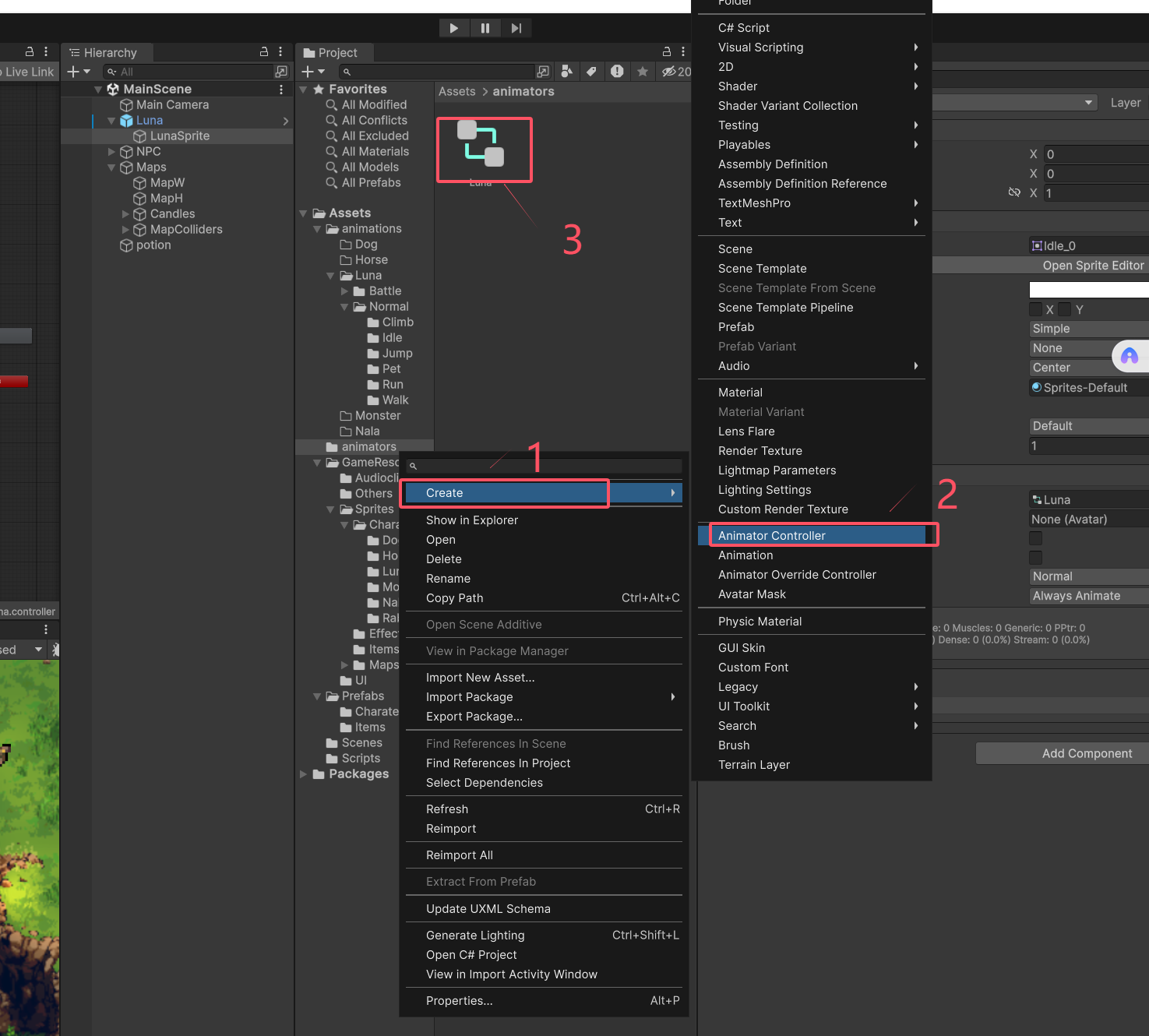 动画组件 创建animator control 并且附加到 对象的组件animator上面