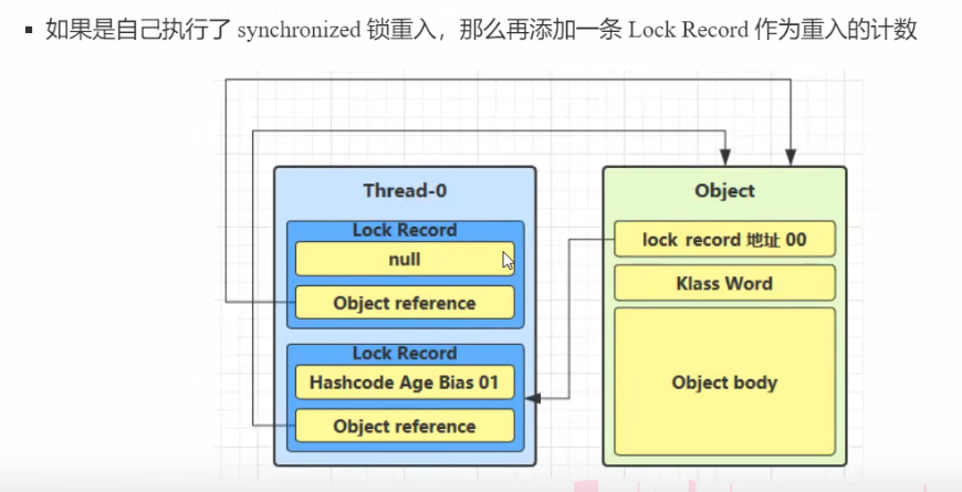 判断方式:在加锁时,如果发现对象的Mark Word指向的是当前线程的栈帧,说明是锁重入,直接继续执行同步代码即可。