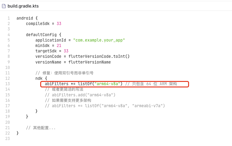 abiFilters += listOf("arm64-v8a") // 只包含 64 位 ARM 架构
