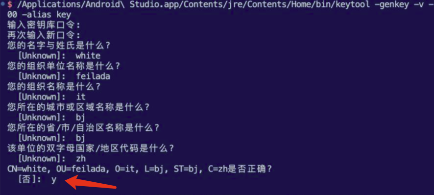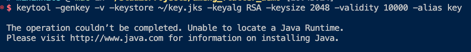 /Applications/Android\ Studio.app/Contents/jre/Contents/Home/bin/keytool -genkey -v -keystore ~/key.jks -keyalg RSA -keysize 2048 -validity 10000 -alias key