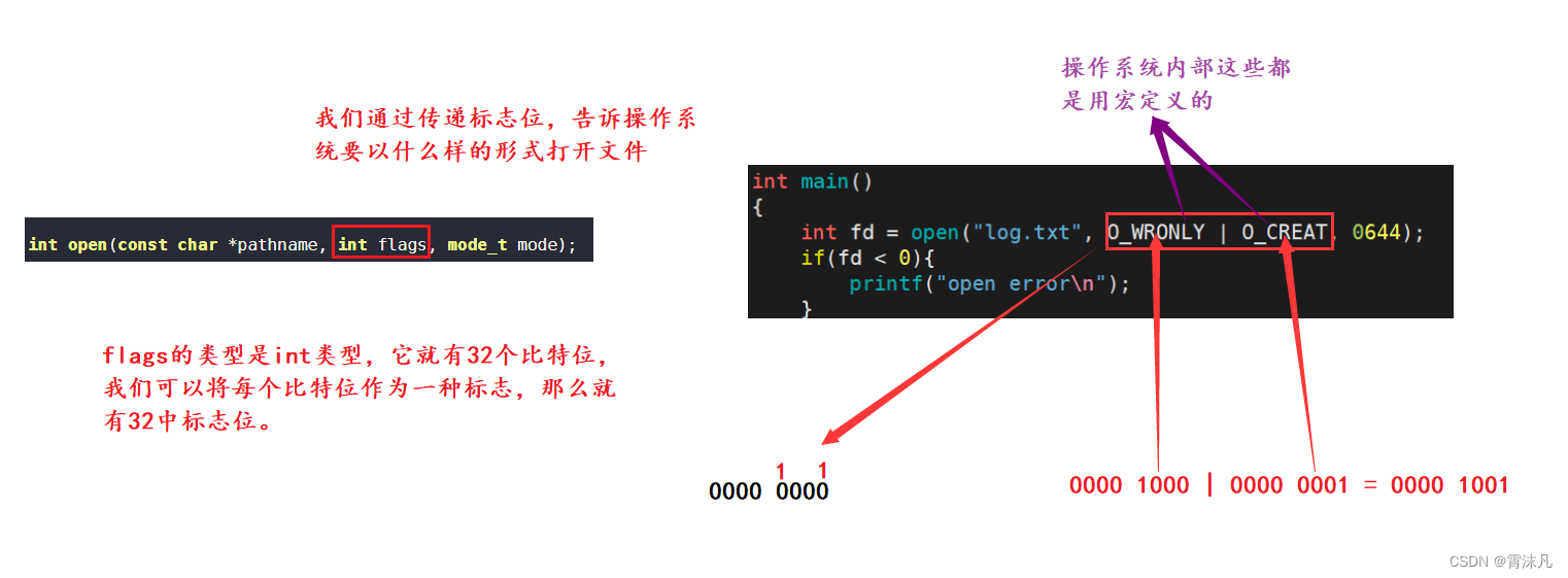 flags的类型是int,他就有32个比特位,一个比特位就可以代表一个标志位,如果两个或起来就可以传递多个标志位。操作系统内部在进行按位与运算,判断那个位被设置了1或0,从而对文件打开方式进行设置