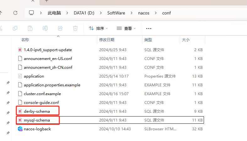 从 nacos官网 下载并解压到自己的电脑上,找到 nacos/conf文件,默认有两种数据库的。