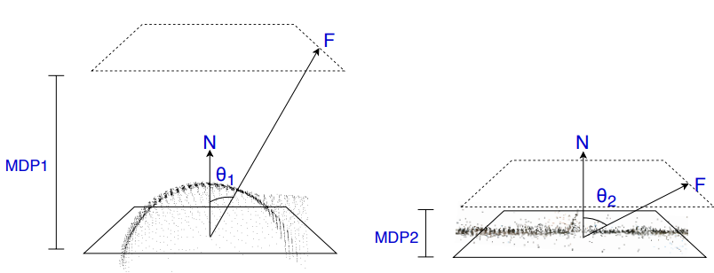 如上图所示,曲面产生的 MDP 值较大(左),而平面产生的 MDP 值较小(右)。对于相同大小的patch,较大的 MDP 值会导致 F 和 N(平面法线)之间的角度 θ 较小。其中: