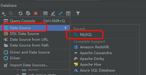 在IDEA右侧点击DataBase,点击+导入数据源,选择mysql数据源